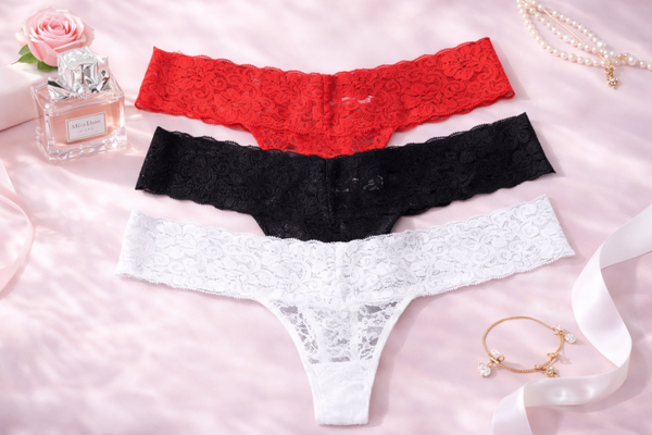 Damen Spitzen String Tanga 3er Set – Nahtlos & Sexy | Elastische Spitze | Weiß, Schwarz, Rot, Pink